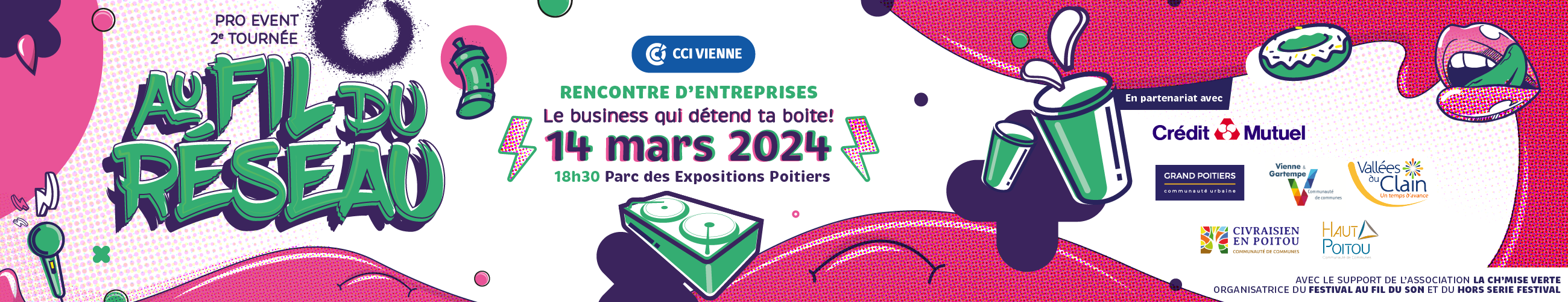 Après le succès de la 1ère édition en 2023, l’événement Au Fil du Réseau revient cette année le 14 mars. Toujours au Parc des Expos et en partenariat avec le festivalier Au Fil du Son, la CCI de la Vienne invite les entrepreneurs à passer une soirée originale d’échanges avec des artistes de culture urbaine.